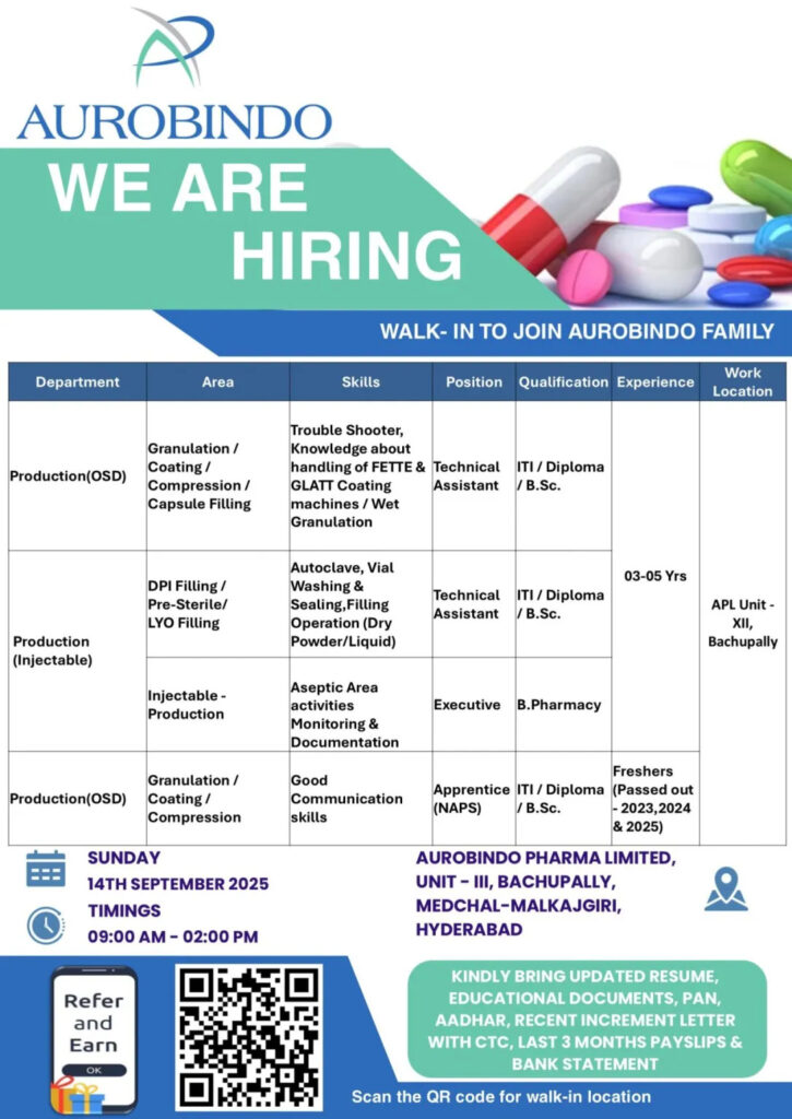 Venue Details & Work Location :  Aurobindo Pharma Ltd – Unit III, Bachupally, Hyderabad – 500090