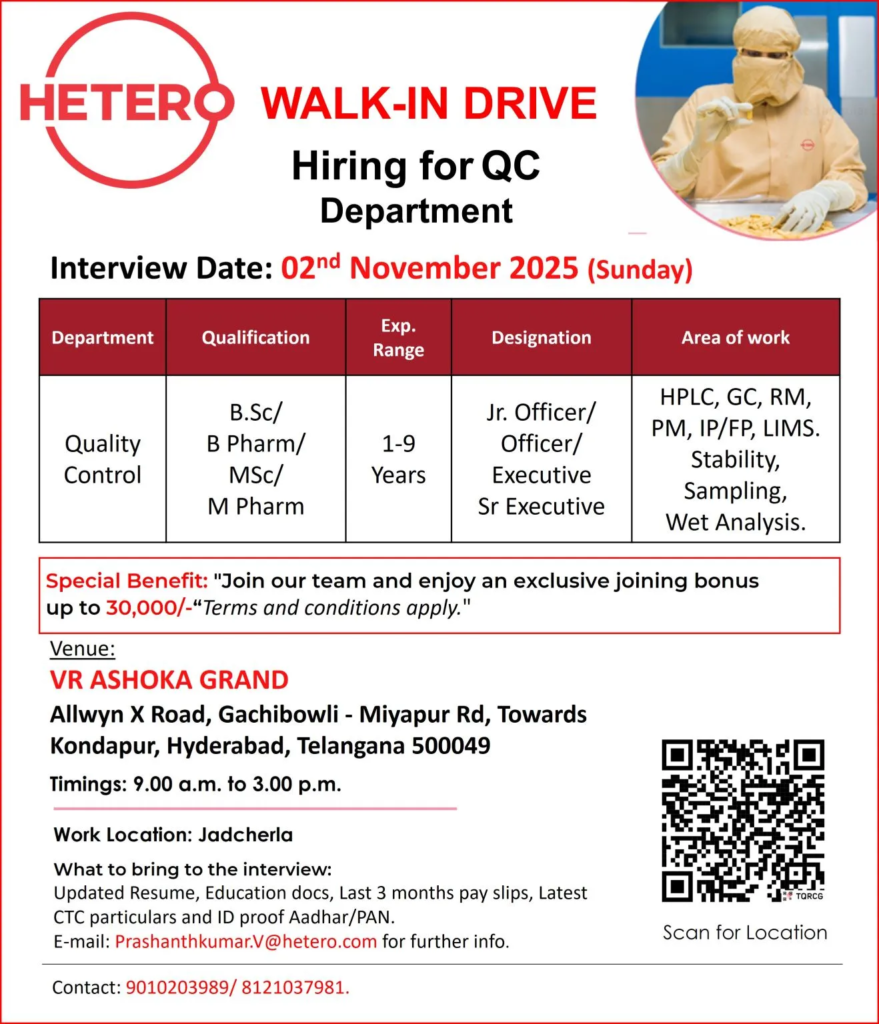 We Are Hiring – for Quality Control (QC) Professionals! Hetero is conducting a walk-in recruitment drive for our Quality Control Department. If you are passionate about pharmaceutical quality systems and ready to build a strong career, we would love to meet you.